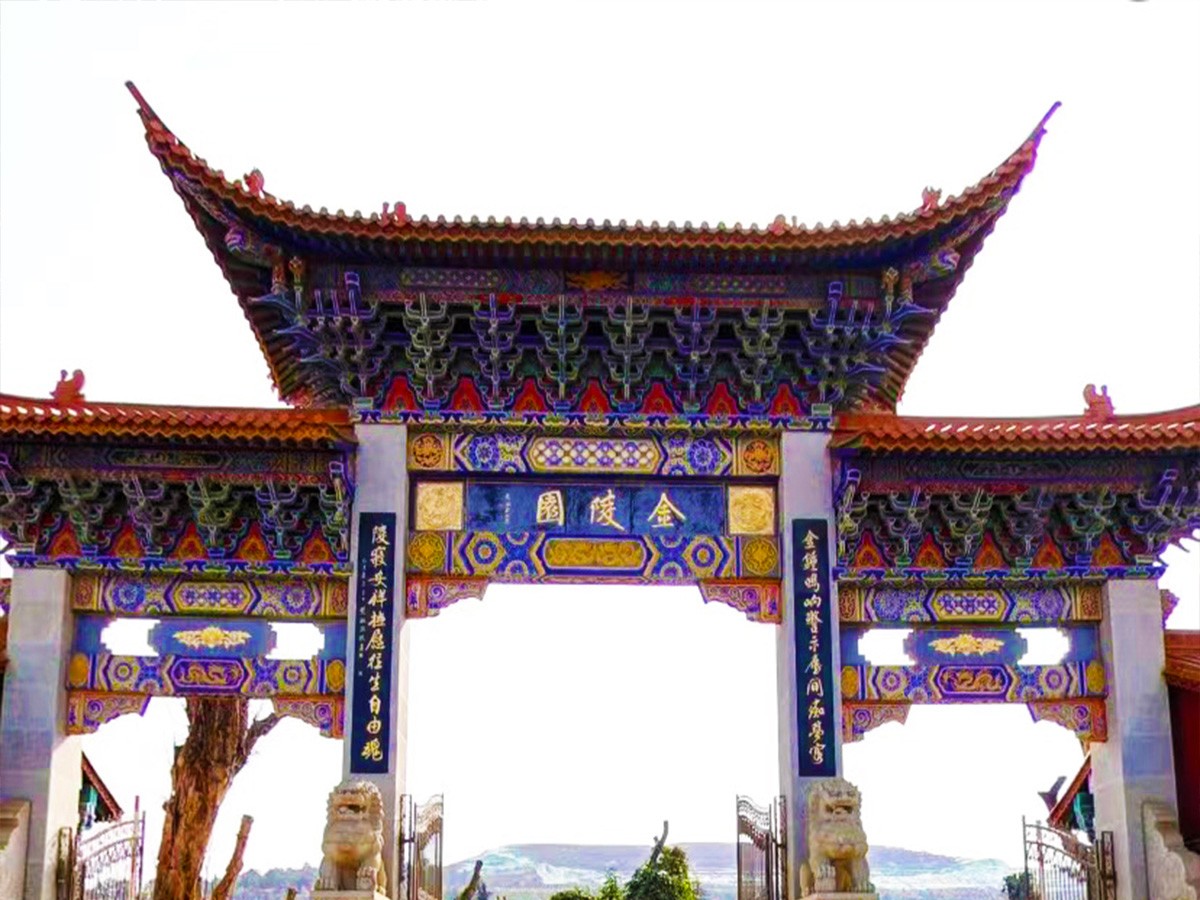 金陵公墓建筑的配置与组合,均以传统建筑学中的形势理论为指导,布局规划严谨,色彩绚丽而寓意深刻。其中,无论建筑、花草、小品、墓碑等等所有院中一切,均按照大小、高低、远近、疏密以“百尺为形,千尺为势”的尺度进行审美控制,将山川形韵纳于视觉,实现“驻远势以环形,聚巧形而展势”之目的,给人以“高而不险,低而不卑,疏而不旷,密而不逼”和“静中有动,动中有静”的良好视觉印象和强烈的艺术感受。以此,恢宏、壮观、精美的建筑和山川自然气势巧妙融为一体,象征、寓意着生与死的永恒不朽。对应陵园中,每一排墓穴都整齐划一,且依山而立,面南背北,暗合古代“故人西去,紫气东来”之说。整个金陵园,如一把堂皇、庄严的龙椅,稳靠在青龙山“四龙交汇”之地,聚集着天地日月之精华。金陵园“从公墓位置来讲,占尽天时地利人和。古往今来,丧葬之事,尤讲位置。金陵园背靠青龙山,面临白沙河,东有封家山、九连山;南有旱龙山,凤凰山;西照碧山、案山、朝山、白沙河水库、小龙潭;北有睡龙山、八宝山、大龙潭。金陵公墓墓区所在的山为青龙山,属九连山下脉。墓区居于中心,四周群山环抱,气势恢宏,大气磅礴,九连山系九个山峰连接而成,是公墓背后的一道天然屏障;封家山好似公墓的后枕,青龙山为公墓的靠椅;左旱龙、右睡龙象征公墓的卫士;前面白沙河水库如同一金盆。这样的地势标志着逝者安睡在青龙这把靠椅上,后有封家山作枕,高枕无优,久连山做屏障,挡风御寒,左右二龙做护卫,安然无恙,前有金盆洗脚,方显富贵,远跳照碧、案山、朝山、湖光山色,田园风光尽收眼底。